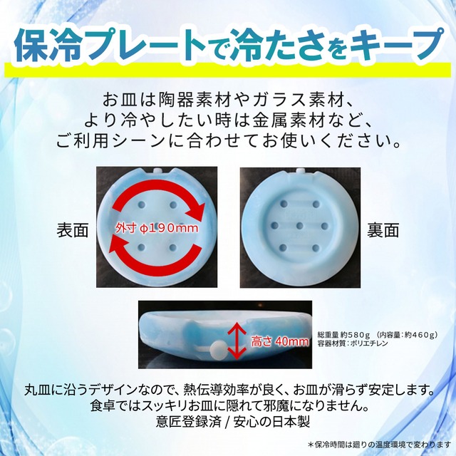 お刺し身、カルパッチョ、カプレーゼ、サラダなどを盛り付けた料理用皿を載せると、2時間以上ひんやり美味しい温度(適温)に保つ”お皿型の保冷剤”で、お家でのゆっくりとしたお食事や晩酌の時間をぜひお楽しみください。